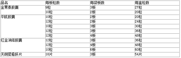 5、金胃泰膠囊20粒/盒老包裝用到批號110301為止,新包裝變動(dòng)情況:取消中盒用收縮袋或膜替代;刪除小盒上的“無防偽簽或被破壞、本公司不能保證質(zhì)量”字樣;小盒上不貼防偽標(biāo)簽;變更小盒、說明書上的電話號碼和傳真號碼;改變小盒尺寸。